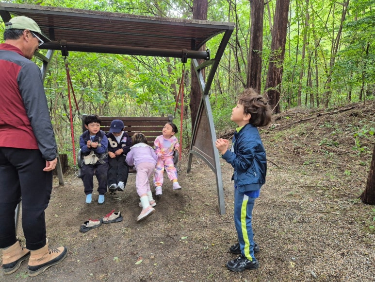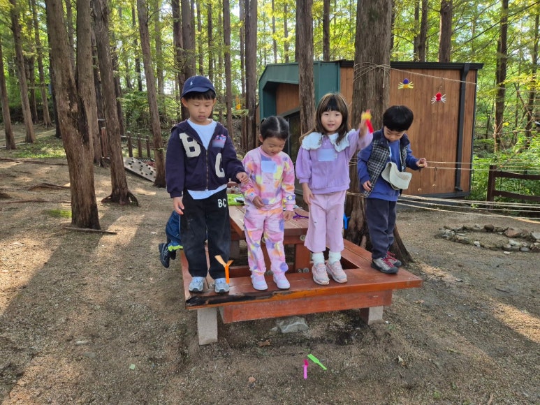 트램펄린 위에서 “무궁화 꽃이 피었습니다~!” 놀이도 하고 그네도 타며 깔깔 웃음소리가 숲속에 울려 퍼졌답니다.